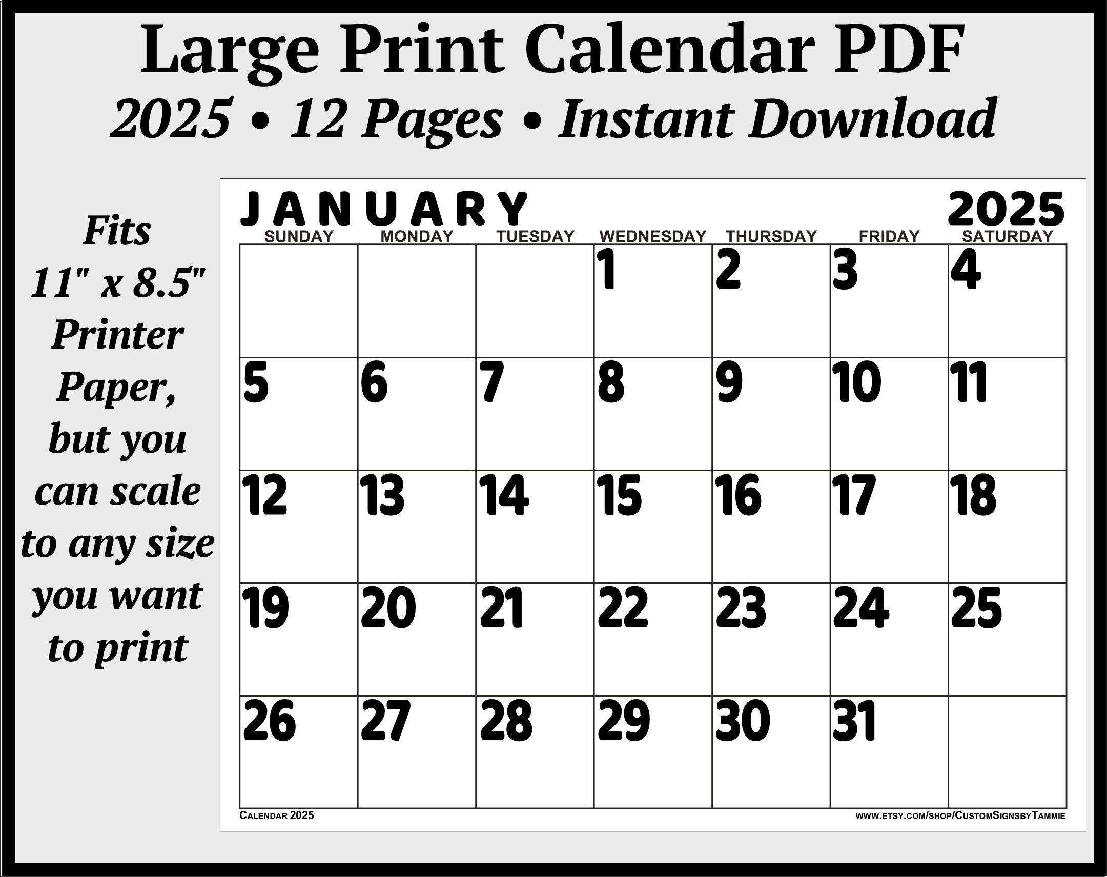 Large Print Monthly Calendar 2025 Senior Citizen Calendar With Large Numbers Sunday Start Printable PDF Etsy