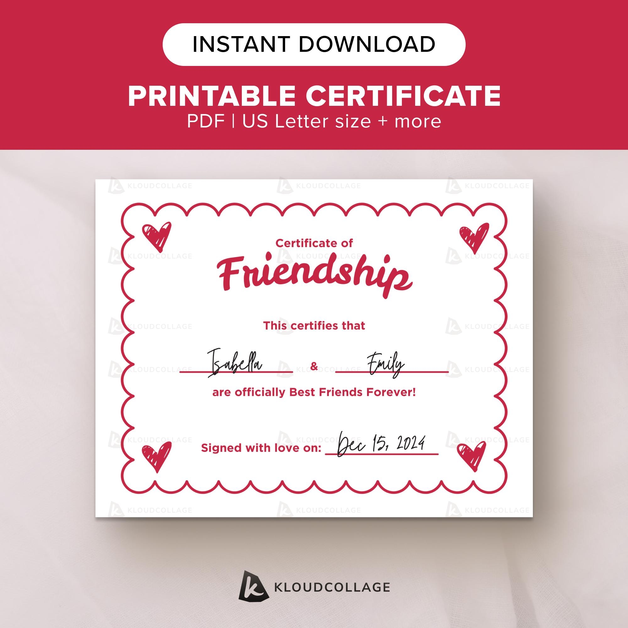 Certificate Of Friendship Award Style Gift With Editable Text Home Printable Digital Download Pdf Etsy