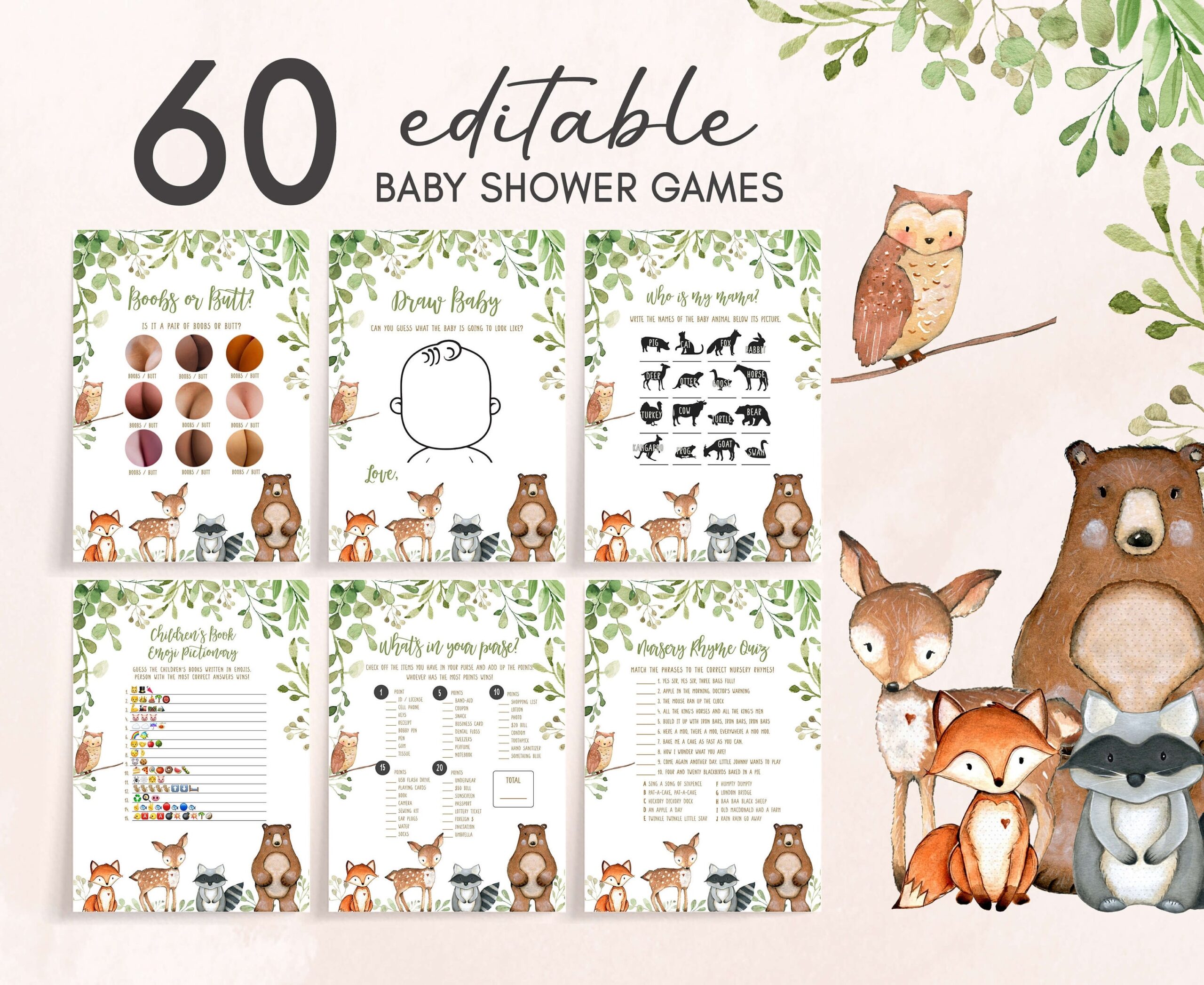 Editable Woodland Baby Shower Games Bundle Greenery Woodland Animals Baby Shower Game Pack Gender Neutral Forest Baby Shower Games 0395 Etsy