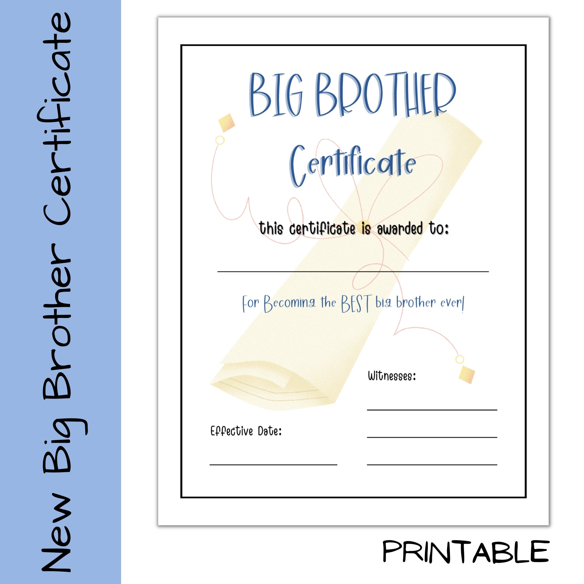 Big Brother Certificate Printable For Kids New Sibling Keepsake Gift A4 US Letter Sizes Etsy